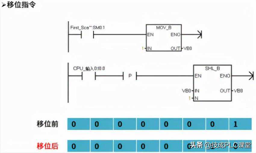 如图2,SHL_B为左移位指令,IN指的是需要移位的操作数,而N则代表移位的个数。程序中VB0的初始值为2进制的00000001,左移一位后最高位丢失,整体左移一位,最低位补0,则变成2进制的00000010。