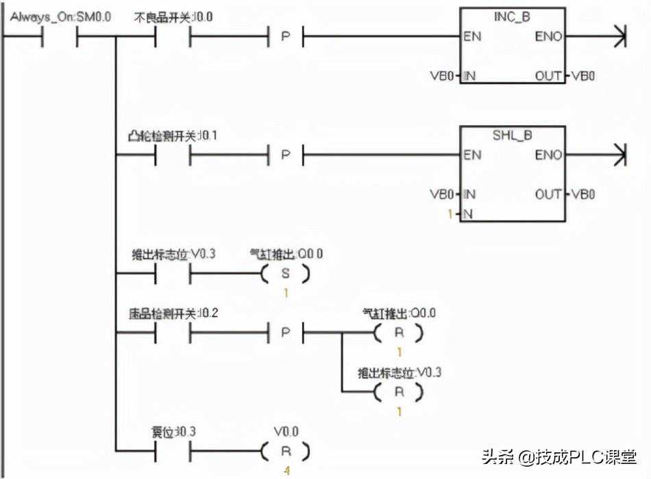 2.当第N个产品移动了4次后,VB0中的位为1,而产品刚好到达第“4”号工位,为1,气缸推出。当第N+1个产品移动了4次后,VB0中的位为1,而产品刚好到达第“4”号工位,为1,气缸推出。