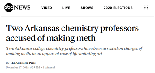 【道记者温家越】热门美剧《绝命毒师》讲述了一名高中化学老师自制冰毒的故事,但令人惊讶的是,最近电视剧中的情节竟在阿肯色州真实“上演”了:11月15日,两名化学教授被控在大学自制冰毒,被警方逮捕。