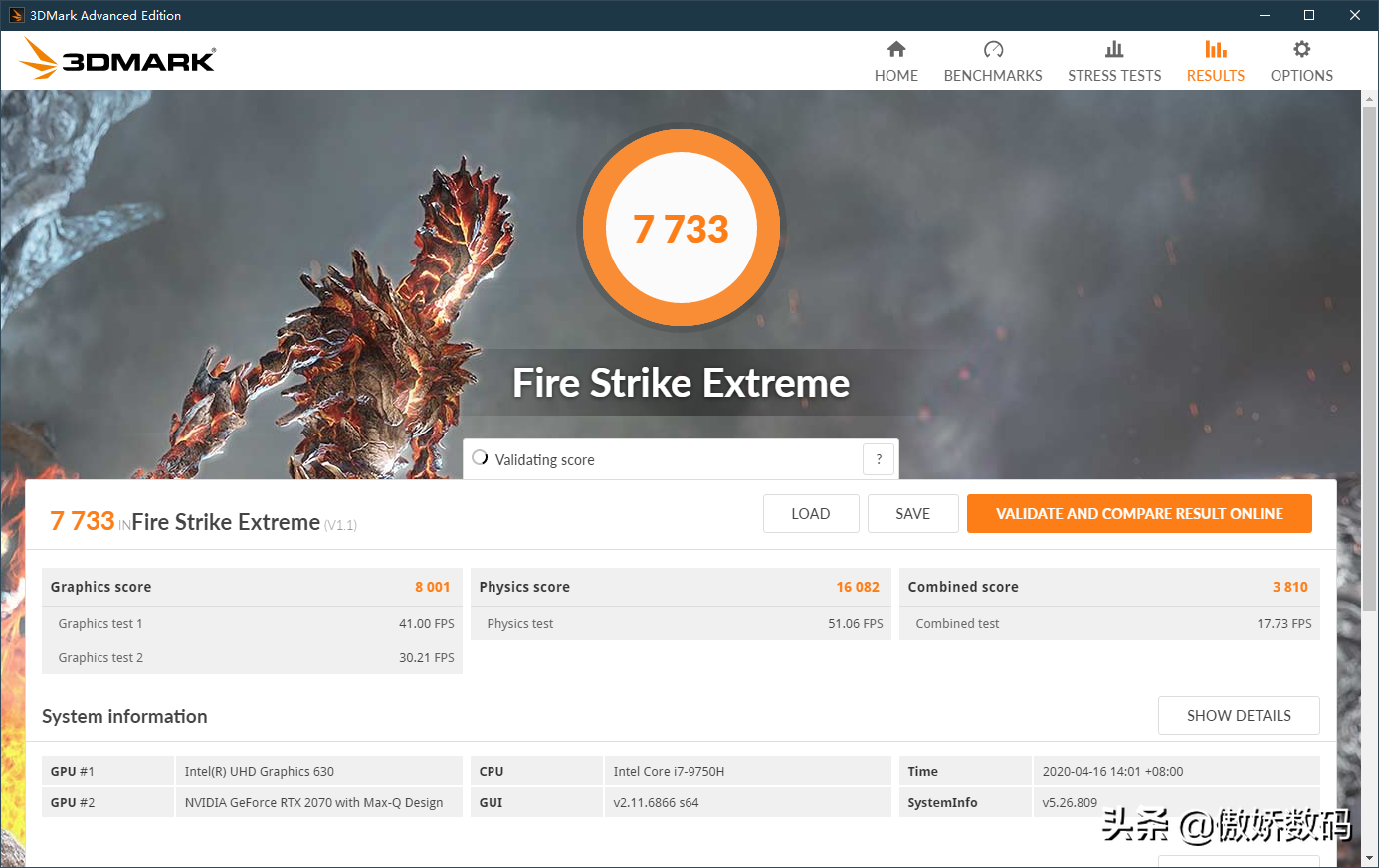 最后跑跑3dmark,FSE显卡分刚突破8k,正好是8001分