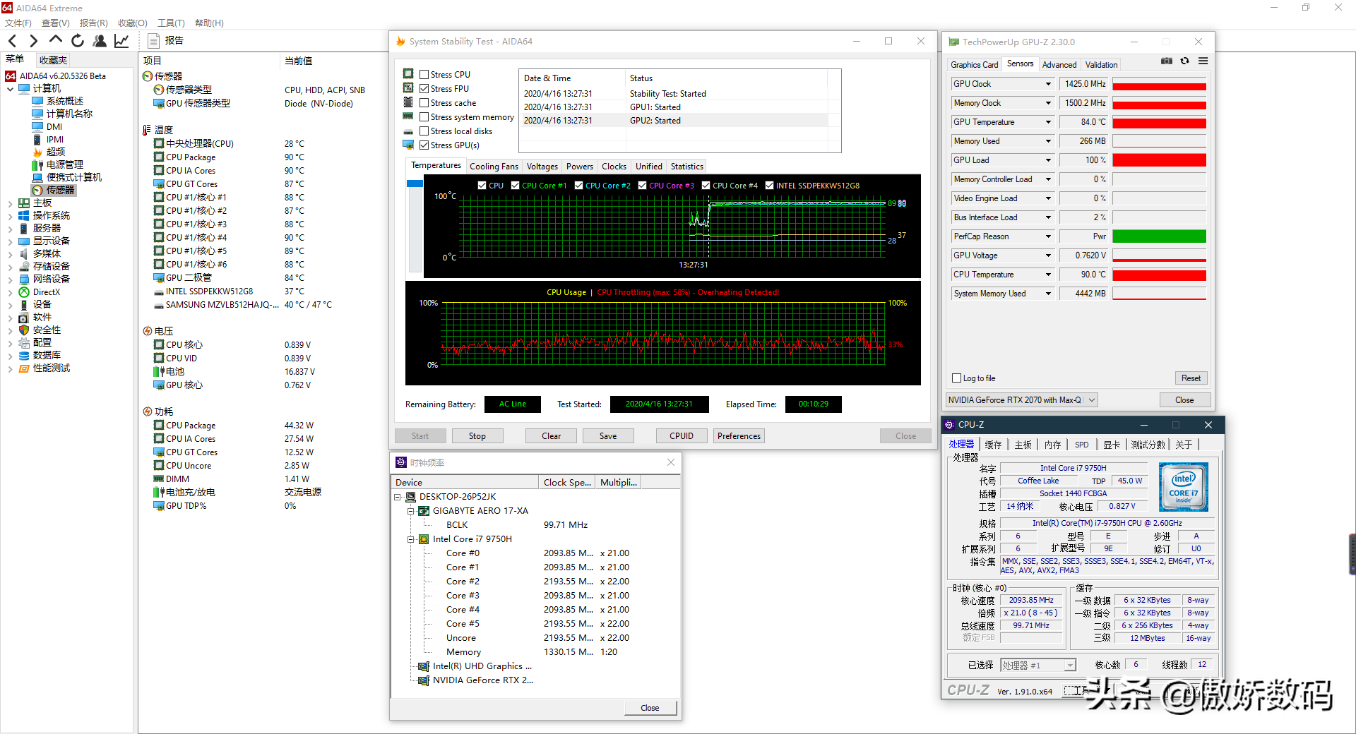 但是笔记本平台限制于散热问题,长时间负载状态能维持多高的频率是个很关键的问题。这里用AIDA64自带的压力测试程序,勾选FPU和GPU两项进行双烤10分钟之后频率温度基本稳定,最终CPU维持在全核2.1g的水平,显卡则boost到了1425的频率,整体温度在85-90度之间。此时风扇已经起飞,不过C面键盘区的温度控制的还不错,带上耳机打游戏的话也不会有什么不适的感觉