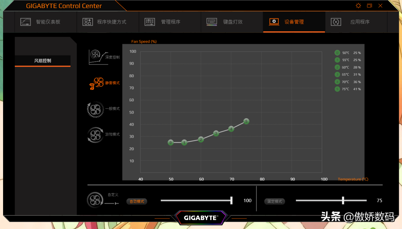 以及风扇策略的调整,一般上网的时候用静音模式控制风扇转速,打机的时候才调整游戏模式加强散热