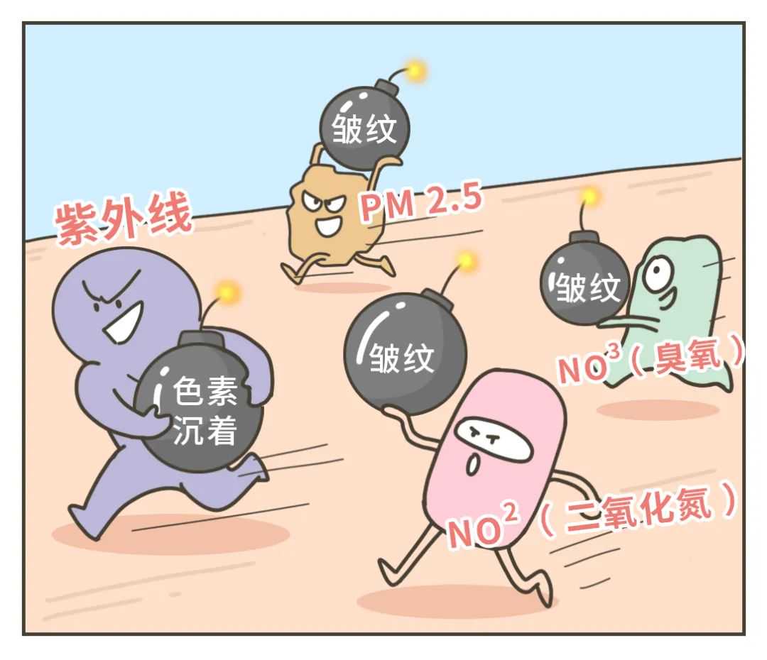 白天,我们的皮肤暴露在日光辐射等刺激环境中,空气污染会加速皮肤老化,空气里的颗粒物和二氧化氮会加重皮肤色素沉着,大气里的臭氧会诱发皱纹产生[4]。