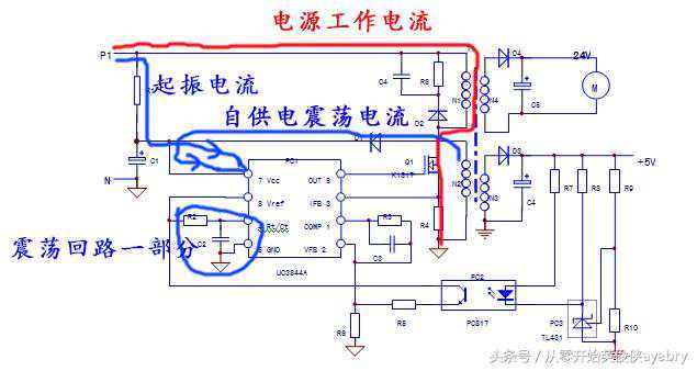1)震荡回路:开关变压器的主绕组N1,Q1的漏-源极,R4为电源工作电流的通路;R1提供了启动电流;自供电绕组N2,D1,C1形成震荡芯片的供电电压。这三个环节的正常运行,是电源能够震荡起来的先决条件。