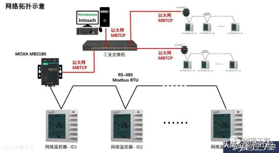 有个朋友在厂里做FMCS厂务监控系统的项目,需要对YORK空调面板上的一些参数进行采集和设置,上位机软件采用Intouch2014R2SP1。现场有百余个YORK的面板,面板上带有RS-485ModbusRTU协议接口,通过MOXA的MB3180网关分为多路把ModbusRTU转为ModbusTCP协议供上位机采集。现场每个MB3180下大约有20个面板需要采集。网络拓扑示意如下: