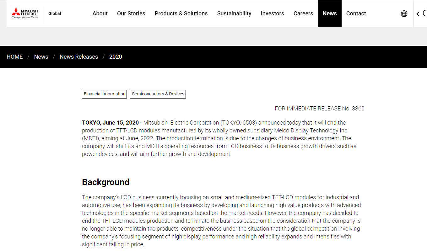 鞭牛士6月16日消息,据三菱电机官网消息,旗下子公司MelcoDisplayTechnologyInc,决定退出液晶面板生产。