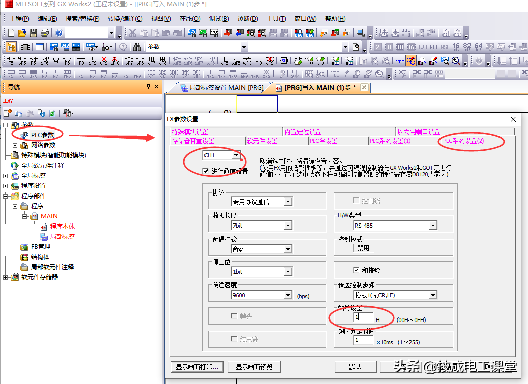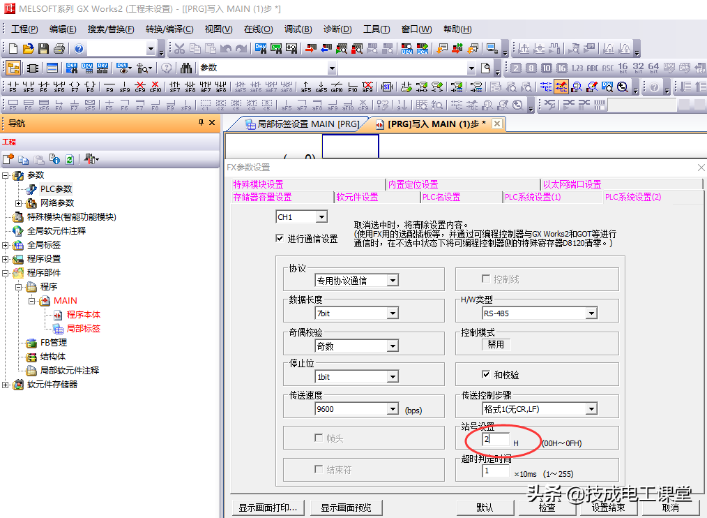 第一台(站号设置为1,注意选择专用通讯协议,然后其他通讯参数要一一对应好)
