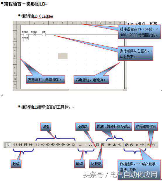 梯形图LD(LadderDiagram)是一种类似电控系统电路图的编程语言,它符合IEC61131-3标准,其基本单元是继电器触点与线圈,程序解算顺序遵从电源柱电流的方向,从左至右,从上到下,特别适合离散量的逻辑控制。