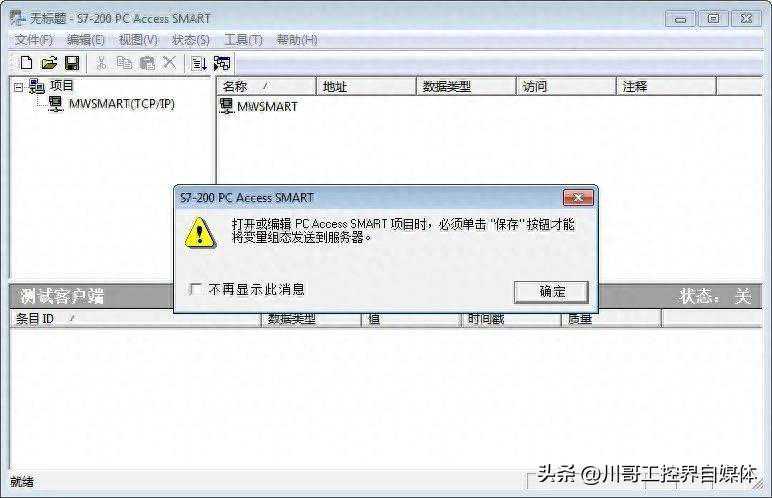 第一次打开S7-200PCAccessSMART软件,会随软件同时出现一个提示窗口,其内容是告知使用者,在进行OPC通信之前,对S7-200PCAccessSMART项目进行保存。