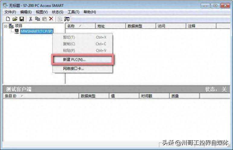 第一步:选择要通信的S7-200SMARTPLC,鼠标右键“MWSMART(TCO/IP)“,选择“新建PLC”。