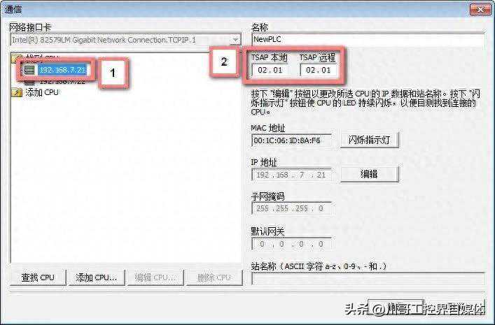 第二步:在弹出的窗口中“查找CPU”,在网络中选择要做OPC通信的PLC,紧接着设置本地和远程的TSAP号。