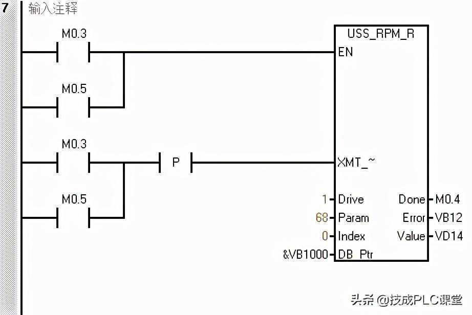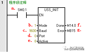第七步:(首次接通读取变频器输出电流,用轮询方式循环读取变频器输出电流、读取变频器输出电流值并存入VD14里面,读取完后完成标志位接通)