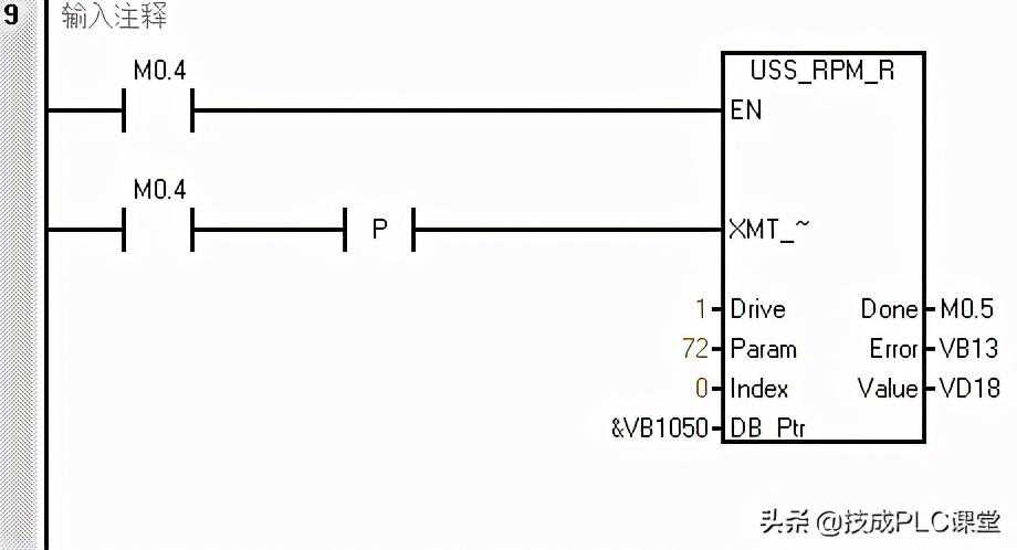 第九步:(用轮询方式循环读取变频器输出电流,读取变频器输出电流值并存入VD14里面,读取完后完成标志位接通)