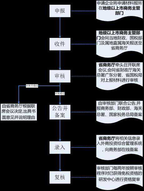 外资研发中心免税进口设备的资格审核的流程如下(以广东省的外资研发中心为例)