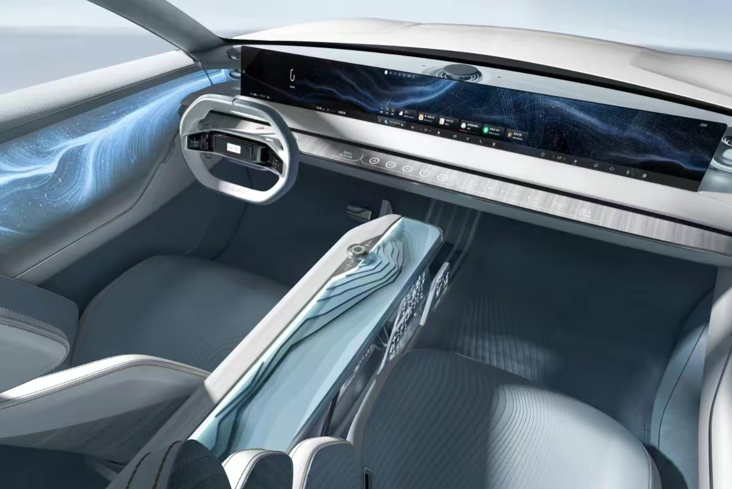 由于目前新车消息都非常有限,因此只能参考其此前亮相的概念车上设计,整体采用极简的设计风格,配备了贯穿式的巨大尺寸悬浮式显示屏,搭配双辐式平底方向盘,以及隐藏在中控台上的触摸按键,且中控扶手设计也相对科幻。
