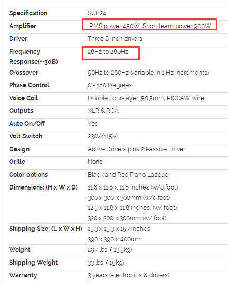 SUB24是一个长宽高都只有30cm的小炮,重量是15kg。在这样一个体积和重量之下,它的频响可以让体积比他大得多的,价格比它高一倍的很多低音炮汗颜。