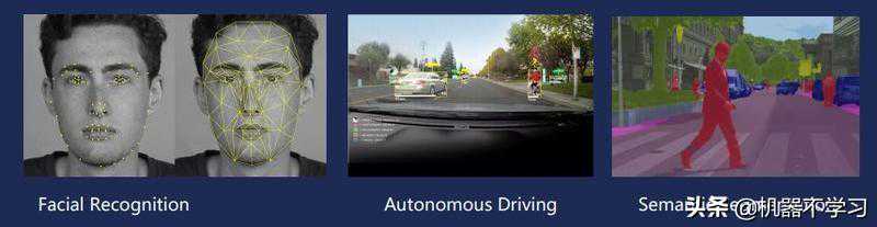由于计算机视觉已经慢慢的趋于成熟,所以它能够颠覆的领域越来越多。基本上我们用人眼和传统的方法能够去识别的东西,计算机视觉都会逐步的改变。左图是比较常见的人脸识别,比如我们现在各种刷脸购物、刷脸进园区,这个刷脸其实就是识别(recognition),根据我们人脸的一些特征点,进行人脸匹配,就能知道是谁。
