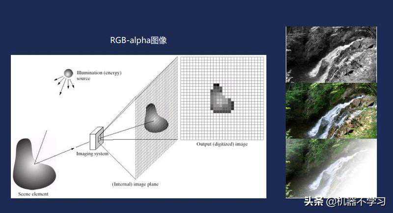 第三个是语义分割。我们人类看大自然的时候,从视网膜成像以后,知道有不同的颜色。机器是通过RGB-alpha去理解这个世界上颜色的。这里RGB就是红绿蓝三原色。一般说的真彩色叫32位彩色,rgb占24位,剩下的8位是alphachanel,代表一个像素是不是透明的。