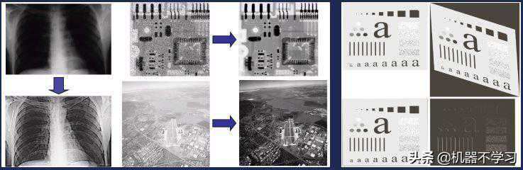 中下是航拍图。由于雾霾或者雾气的原因整张图泛白。如果直接去做一些处理,比如地图上的一些目标识别,效果会非常差。所以先做强化(enhancement),提高对比度,图像变清晰之后再做进一步处理。