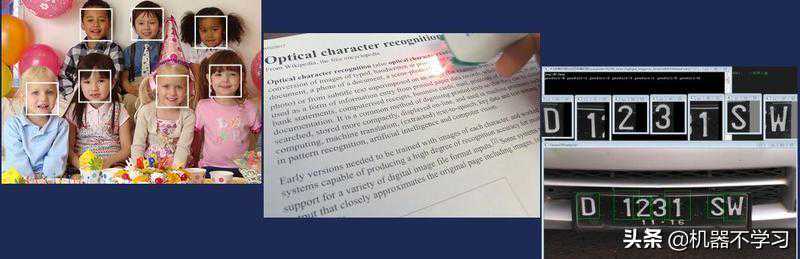 还有一些其他比较常见的例子,包括多人脸识别。就我们拍照的时候会对人脸方向进行重重聚焦。中间的图是文本识别(OCR),图上是用激光笔进行扫描,扫描完了以后再去识别,是很老的一种文本识别方式。现在由于整个OCR的技术相当成熟,基本上是大家提供一个比较清晰的照片,然后全部识别出来。右边是车牌识别,这在国内是非常常用的技术。