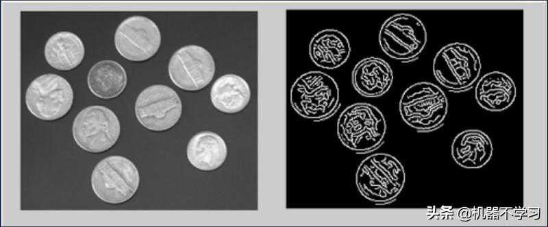 识别图像,首先要让机器能够读到它的一些特征。从这个角度讲,需要进行图像特征设计。比较容易想到的特征提取方法就是边缘特征。以下图为例,要识别图中所有的硬币,可以把硬币的边缘和花纹的边缘提取出来,作为一个图像特征。