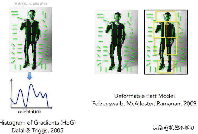 另外一个传统的对象检测方法叫做主观形状模型。我们把对象的边缘全部提取出来,进行各种形变,然后和要识别的目标进行匹配。一旦匹配上了,我们就实现目的。这种方法局限性就是输入的图片角度的变化,或者说我们今天穿着打扮不一样,不一定完全匹配上。