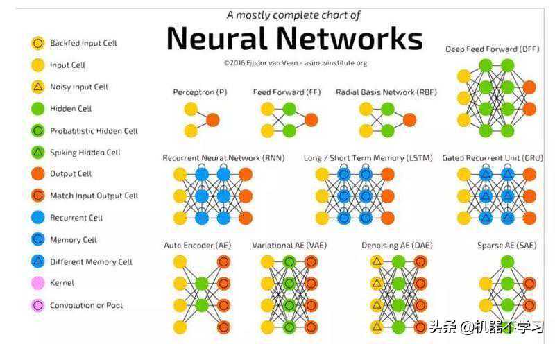 神经网络除了金字塔形,还有下图中的其他形式。这些都是根据不同的问题提出的不同的网络结构。在传统机器学习中,我们是在想用哪种算法,如何调参能够把模型适用这个产品。到了深度学习的时候,算法科学家的大部分研究是在产品上使用什么样的神经网络,哪种类型神经网络,怎么设计它每一层的作用,怎么设计它的激活因子,怎么去设计outputlayer,怎么去做聚合,思维的方式发生了很大的变化。