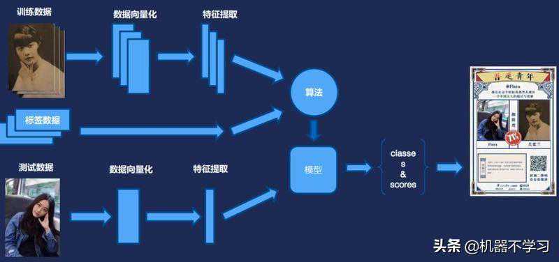 刚开始展示的五四青年节活动是这样做的。首先有几百张民国时期有志青年的照片,提取其中的一些特征,把这些特征数据向量化。每个人标注好标签。训练后就可以生成一个模型。在实际使用时,后台会提取上传照片的特征值,和模型里面已有的进行匹配,然后返回值是一个分类加上一个置信度(score)。最后再合成一个页面,供大家在朋友圈转发。