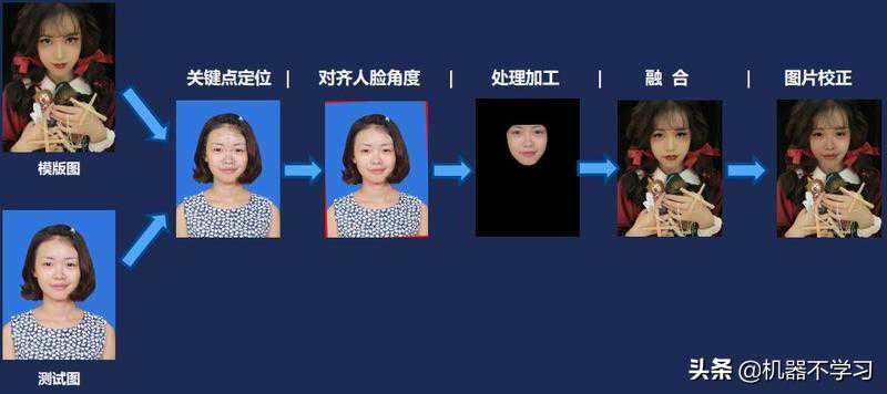第二个是另外一个特别热门例子,人脸融合。大家经常看军装照、古代照,都是人脸融合算法的结果。它原理是这样的:首先用户上传照片,但上传的照片往往不是百分之百正位的,可能会有角度,幅度,为了让融合结果更加的平滑,会进行关键点定位,对人脸进行一些对齐矫正。然后利用算法把人脸抠出来,和模板图进行融合。融合图其实并不是那么自然,所以更多的工作是图片校正,比如曲线调优,边缘融合,色彩调节。这样大家能看到自己回到民国、或者清朝时候的一个照片。