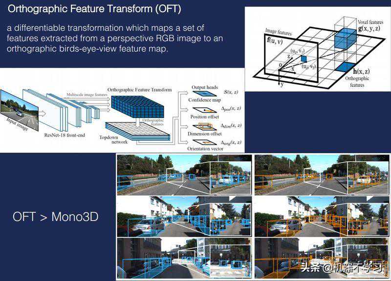 而普通的单目照片只是一个平面图,没有距离信息。最近有个算法叫正交特征变换(OFT),它对静态图片上不同的对象,先进行正交化的特征提取,然后利用这种方式去识别不同对象之间的相对位置。通过一系列的计算,就把单目图变成一个3D图。基本上实现了激光雷达的效果。OFT在目前所有提出来的单目转成3D图方法中效果最好。