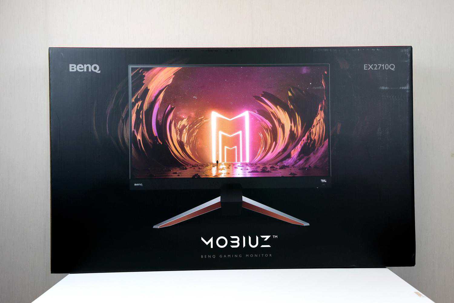 ▲首先映入眼帘的是一个巨大的黑色彩盒包装箱,箱体中间印有产品彩照和它的名字——莫比乌斯(MOBIUZ)。右上角则是产品型号EX2710Q。