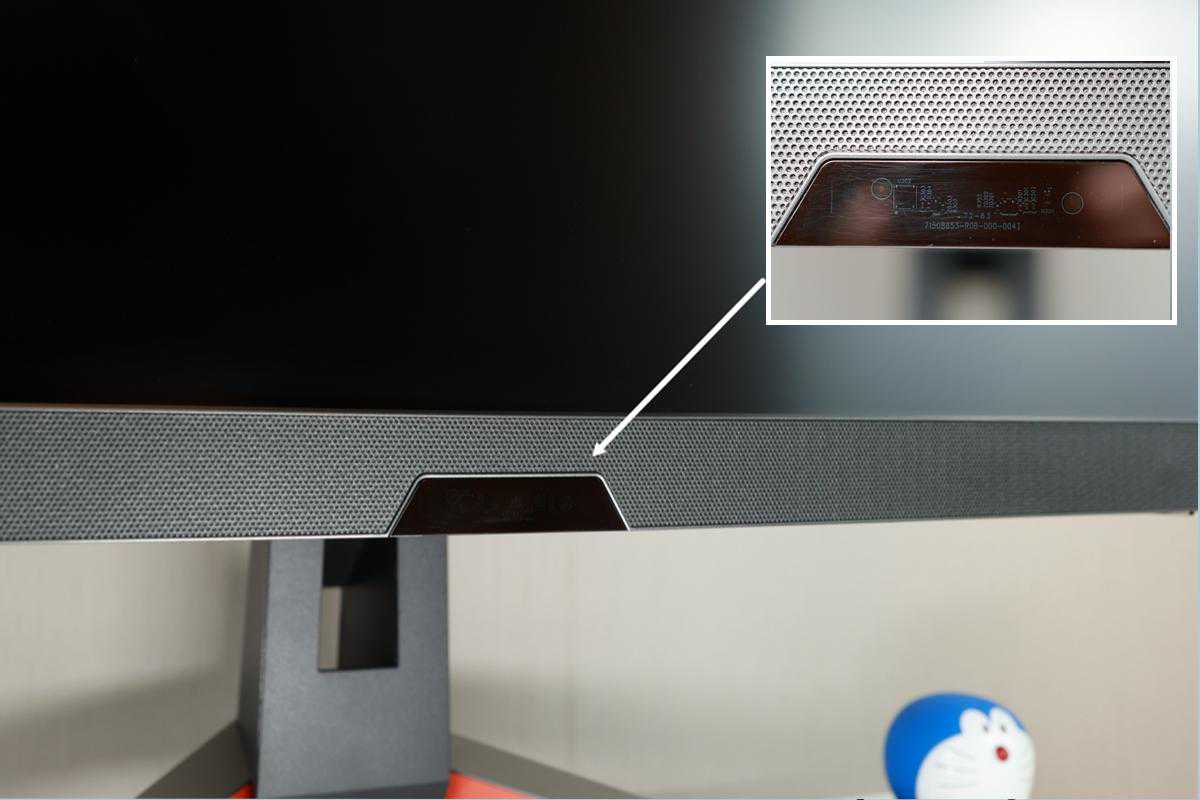 ▲显示器的正面采用了常规的三面超窄边框设计,只有底边较厚,因为底边深灰色这部分内置了很多的硬件。比如在左右两侧就各搭载了一个2W的扬声器单元。