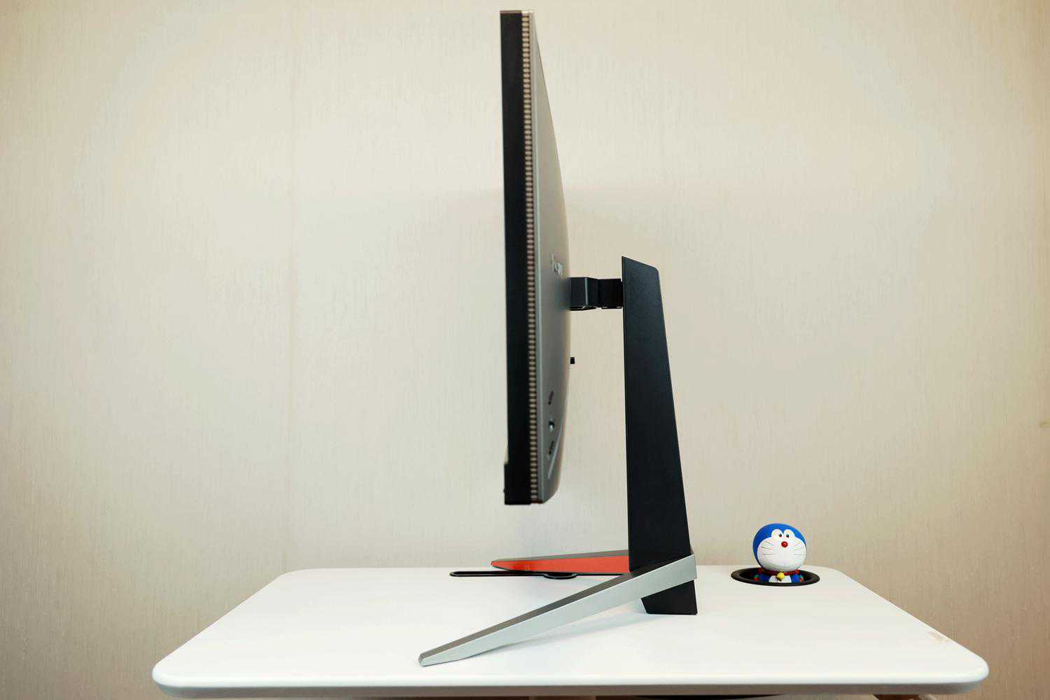 ▲显示器的支撑系统外观上采用撞色设计,底座呈Y字型结构,橘灰配色很张扬;支架则是纯黑色又很显稳重,它们的材质是都金属骨架外包工程塑料,支架上还预留了理线孔。