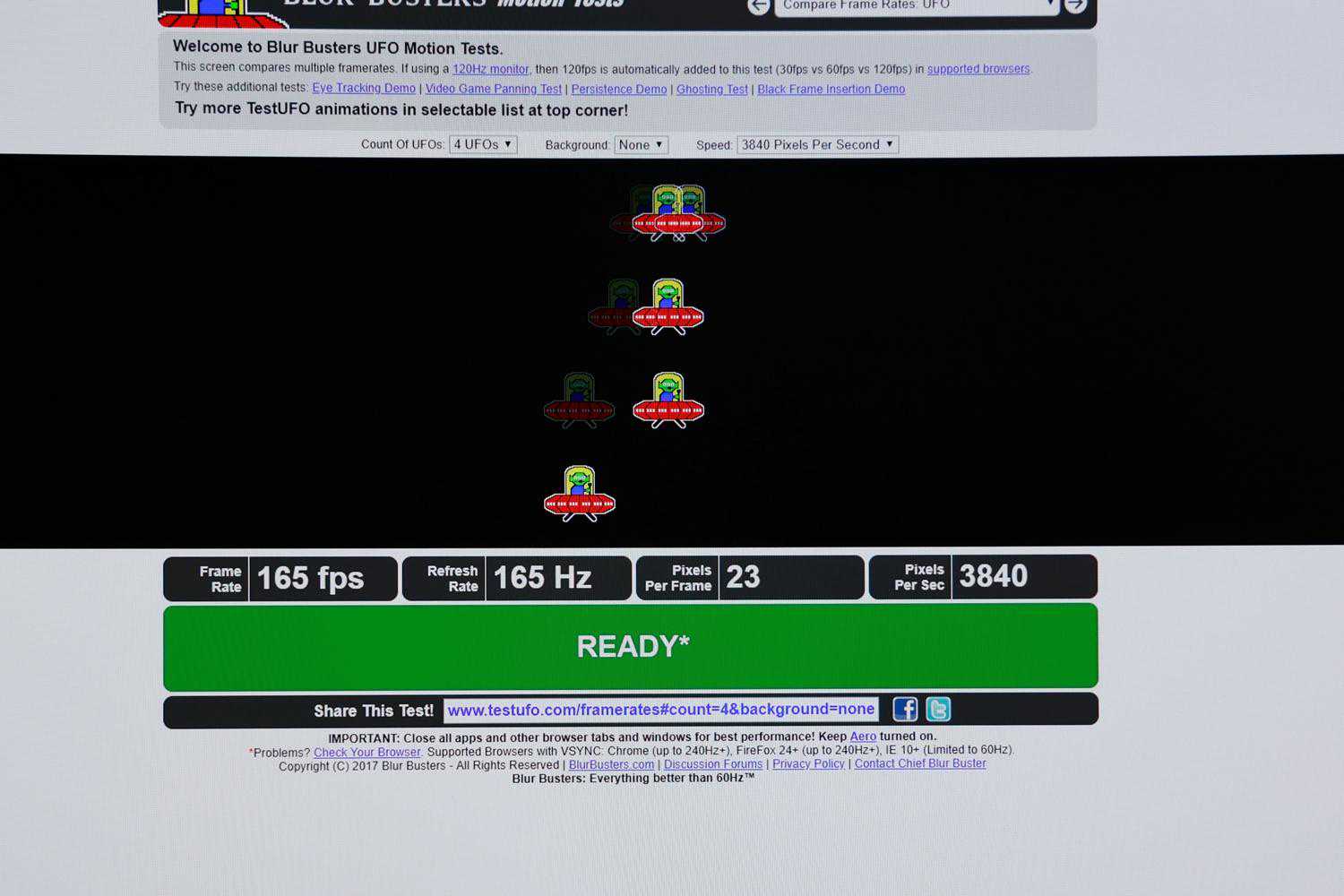 ▲通过UFOTest测试,可以看到显示器可以稳定运行在165hz下。