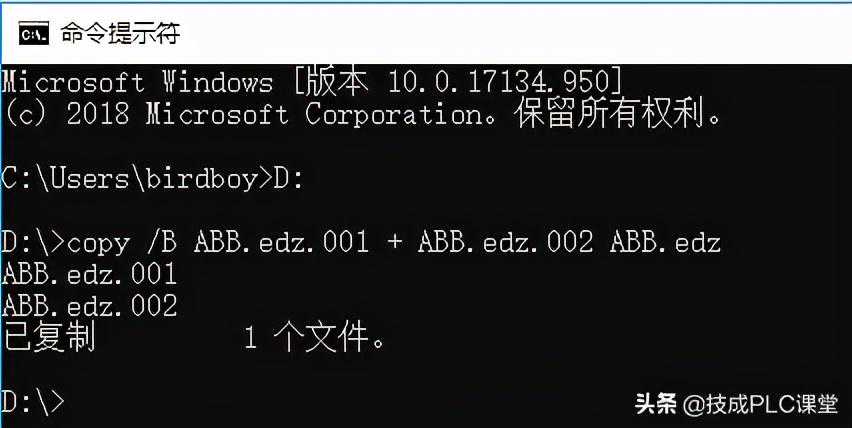 (4)用以下命令将和合并为压缩包文件。copy/+多个切分包用+号连接,如下图