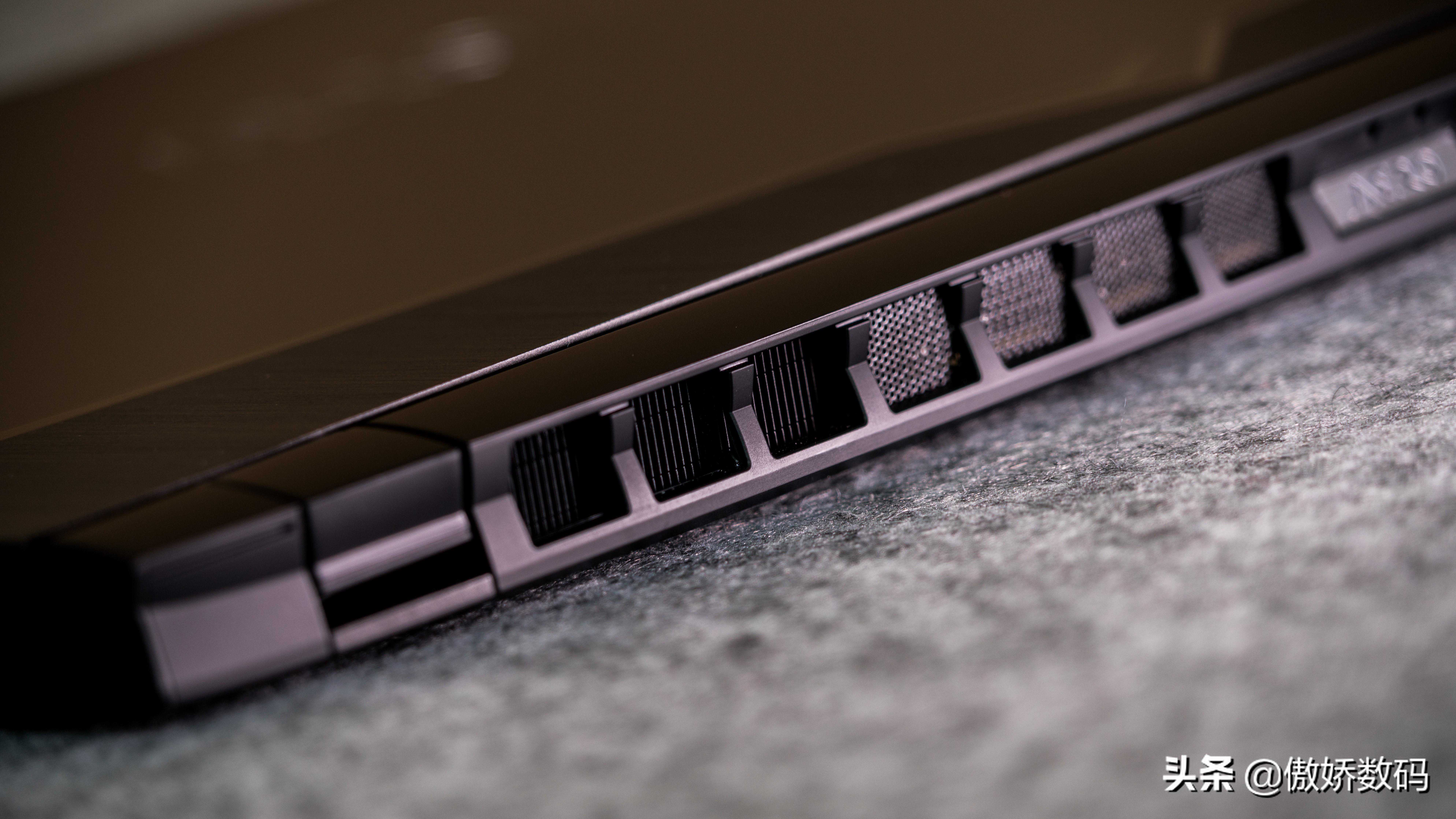 也因为这块中置铭牌和左右对称出风口的设计,从后面看这台本本颇有点跑车的线条设计感