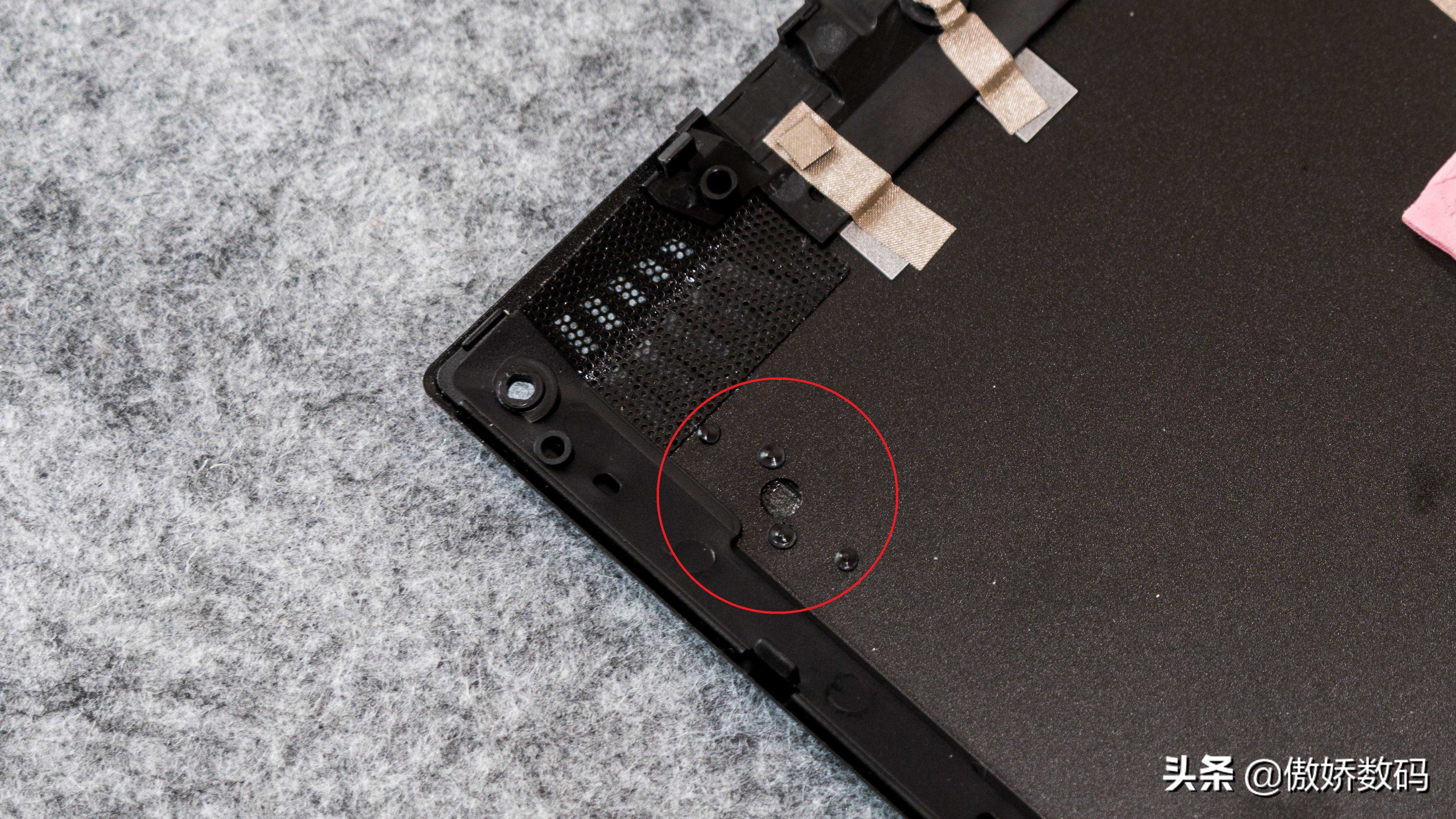 在看各个主要部件的时候,其实就可以发现这台本本内部的做工细节还是不错的。虽然少不了诸如WiFi信号线和显示屏信号线这样的飞线连接,但是设置了相当多的走线槽以及胶带来帮助让内部的走线尽可能有序,下图中红色圈里的都是整理走线用的设计