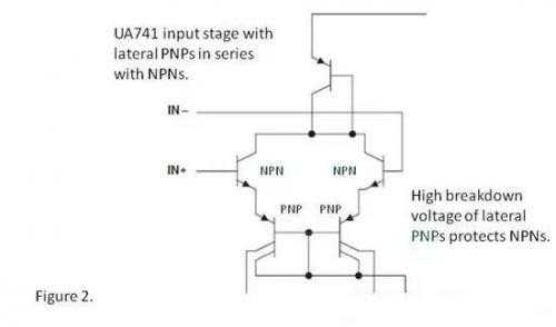 一般而言,双极NPN晶体管运算放大器都有输入钳位,例如:OP07、OPA227和OPA277等。uA741是一个例外,它具有NPN输入晶体管,并且有一些为NPN提供固有保护的附加串联横向PNP。