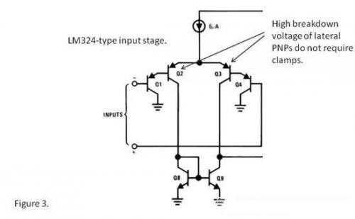 使用横向PNP输入晶体管的通用运算放大器一般没有输入钳位,例如:LM324、LM358、OPA234、OPA2251和OPA244。这些运算放大器一般为“单电源”类型,其意味着它们拥有一个扩展至负电源端(或者稍低)的共模范围。输入偏置电流为一个负数时,表示输入偏置电流自输入引脚流出。这时,我们通常可以认定它们为这类运算放大器。但是,需要注意的是,使用PNP输入的高速运算放大器一般有输入钳位,而这些PNP是一些具有更低击穿电压的垂直PNP。