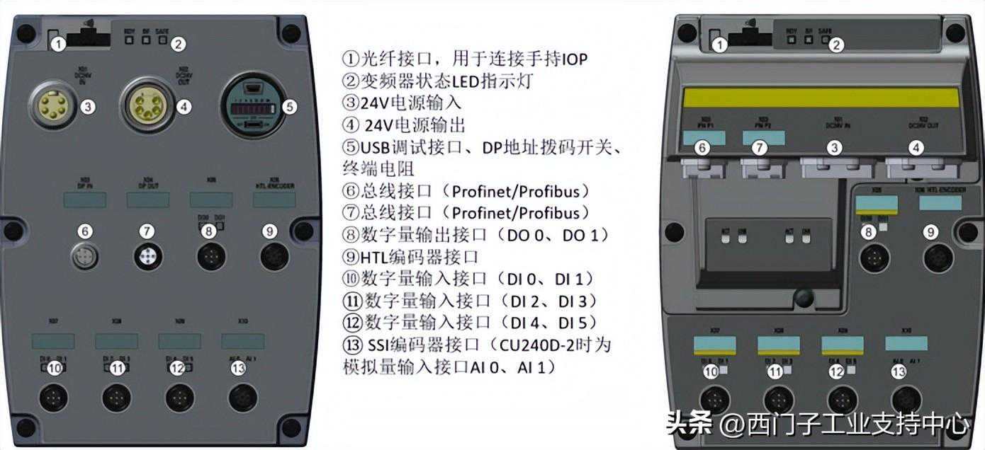 1G120D变频器接口介绍G120D变频器上连接器接口分布如图2-1所示,其中左图为CU240D-2(DP/PN)控制单元,右图为CU240D-2(DP/PN)FPP控制单元。