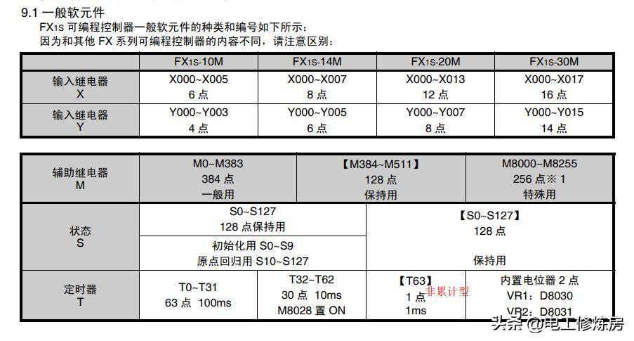 交流电源、24V直流输入类型:FX1s-10MR-001,FX1s-10MT,FX1s-14MR-001,FX1s-14MTFX1s-20MR-001,FX1s-20MT,FX1s-30MR-001,FX1s-30MT