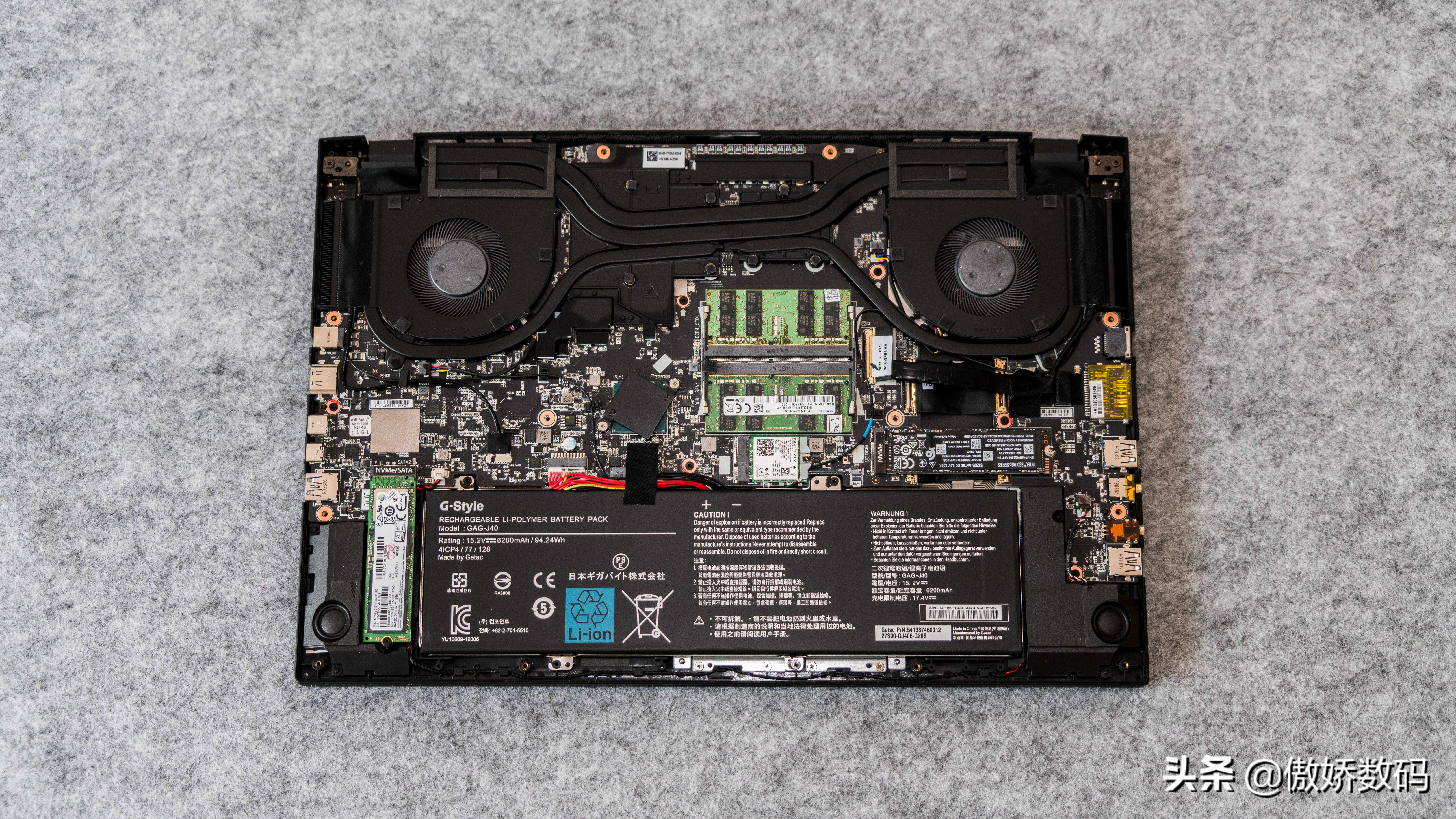 整机内部元件就是这样,大致分为三部分,分别是上方的散热,中部的内存板卡,和最下方的电池