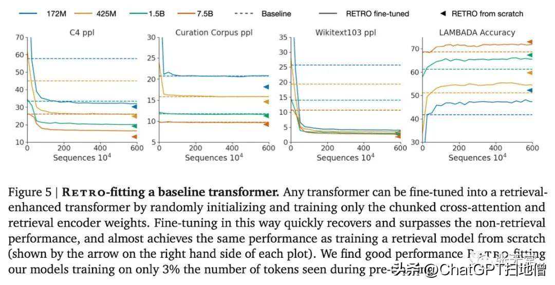 他们还演示了如何对现有的基准模型进行改进。通过冻结预训练权重,只训练分块交叉注意力和邻居编码器参数(7B模型权重的不到10%),他们可以在只需要600万个训练序列(预训练序列的3%)的情况下增强transformers的检索能力。经过改装的模型能够超越基准模型的性能,并且达到了接近从头开始训练的改装模型的性能水平。