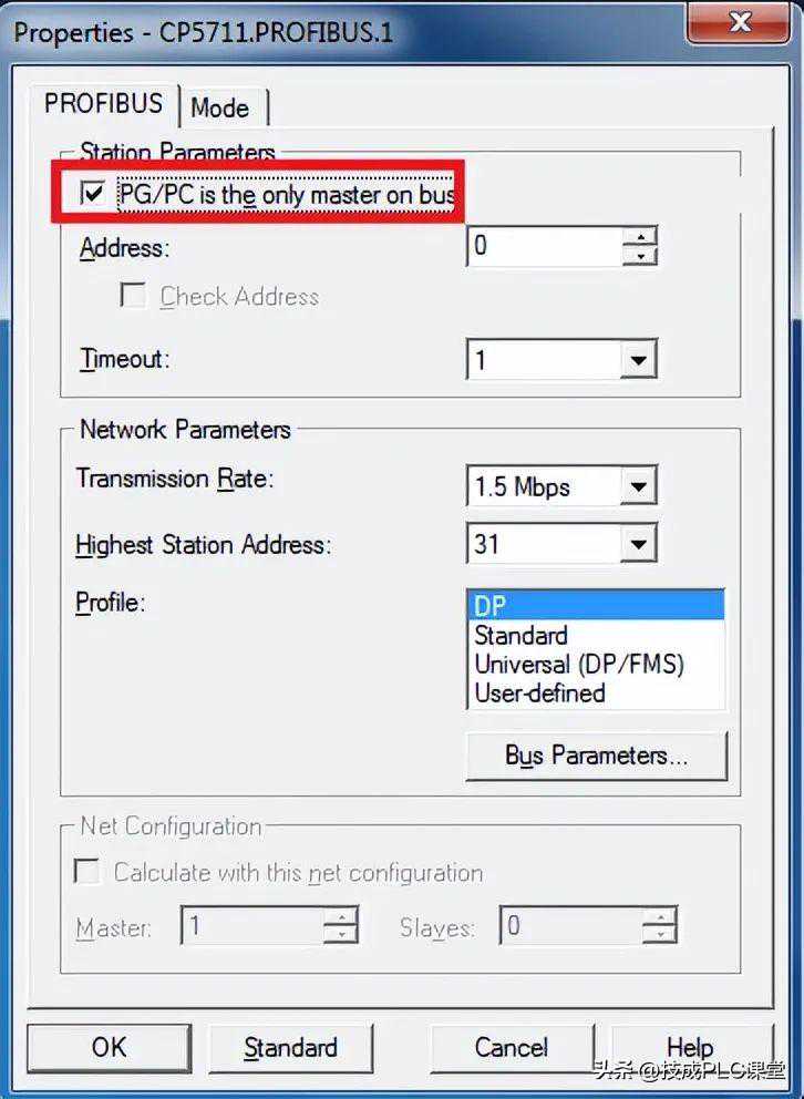 双击设备和网络,并选中精智(Comfort)屏的Profibus网络连线,最高Profibus地址选择“31”,传输率选择“1.5Mbps”,标识号选择“DP”