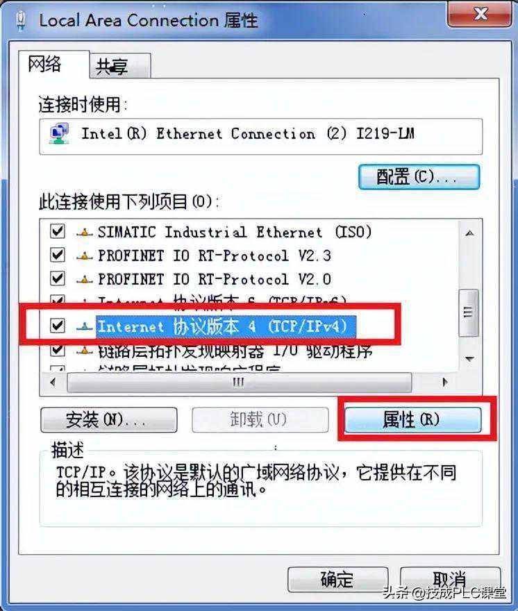 在以太网卡列表,双击连接西门子屏的以太网卡图标。弹出LocalAreaConnection属性对话框。在列表中选择Internet协议4(TCP/IPv4)双击。