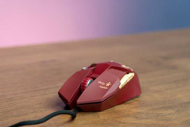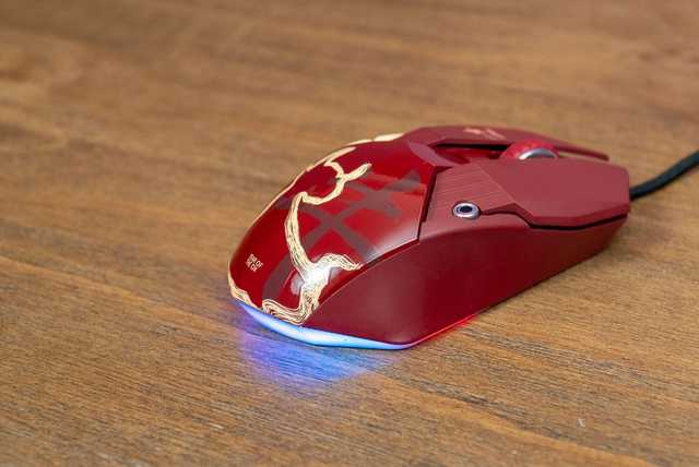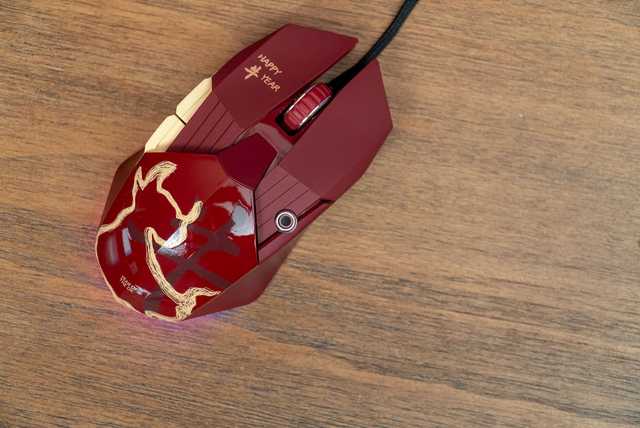 达尔优A970的尺寸为131,如上文所述外壳为对称设计。牛年特别版的外壳一改普通版沉闷的全黑配色,鼠标转为更具传统喜庆节日色彩的金、红撞色,红色的外壳搭配金牛花纹和金色侧键,鼠标一下子变得活泼了起来。
