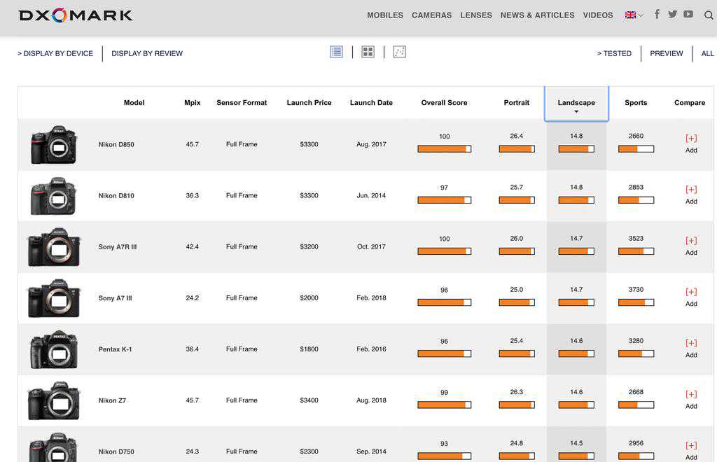 索尼微单Alpha7RIV的官网页面上,对宽容度的描写是:“相机在低感光度下具备15级动态范围,使画面中阴影到高光的渐变平滑自然。“这个描述和Alpha7RIII是同个水准。那么15级是什么概念呢,这个宽容度厉害吗?我翻了一下DXOMARK上的评分数据库,对所有全画幅相机的宽容度做个排序。可惜还Alpha7RIV的数据还未上线,先凑合着看一下Alpha7RIII的宽容度排名。Alpha7RIV的宽容度水平应该和Alpha7RIII差不多。