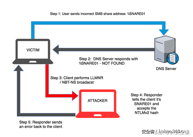 当DNS名称无法解析的时候,客户端就会将未经认证的UDP广播到网络中,询问它是否为本地系统的名称。事实上,该过程是未被认证的,并会广播到整个网络,从而允许网络上的任何机器响应并声称是目标机器。