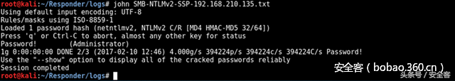 最后一步是破解NTLMv2哈希值,这一步成功与否取决于目标环境中的密码策略的复杂性,这可能需要等待一些时间。当密码策略是已知的,或者怀疑密码安全性较高的时候,ocl-hashcat将是离线破解的上上之选。由于在测试实验室环境中我们故意使用了不安全的密码,因此这里使用john来破解NTLMv2哈希值: