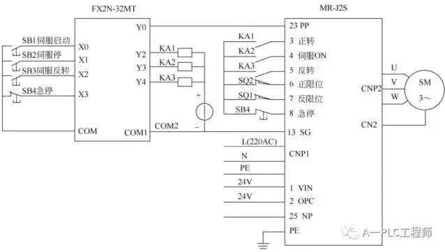 本伺服驱动器的供电电源可以是三相交流230V,也可以是单相交流230V,本例采用单相交流230V供电,伺服驱动器的供电接线端子排是CNP1。PLC的高速输出点与伺服的PP端子连接,PLC的输出和伺服驱动器的输入都是NPN型,因此是匹配的。PLC的COM1必须和伺服驱动器的SG连接,达到共地的目的。
